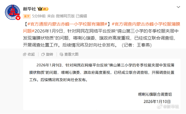 2026年1月9日,针对网民在网络平台反映“锦山第三小学的冬季校服夹层中发现薄膜状物质”的问题,喀喇沁旗委、旗政府高度重视,已经成立联合调查组,开展调查处置工作。后续情况将及时向社会发布。(记者:王春燕)