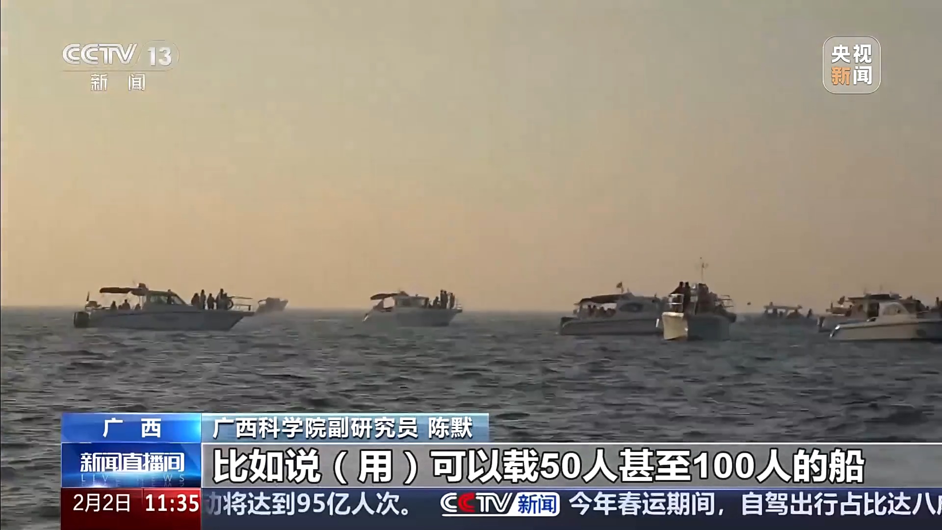 广西科学院副研究员 陈默:现在是以10人、11人的小船载客为主,岛上可能七八十条这种船,如果同时出海去观鲸的话,对于鲸的影响可能会比较多,如果从更好保护鲸的角度来说,我们觉得可以把船的船型还有载客量的这种有所更替,比如说可以载50人甚至100人的船,来取代小船,速度上可以慢一些,因为现在的船速度上有的时候也会太快了,太快对于鲸来说也容易撞到它或者是不小心剐蹭到它们。