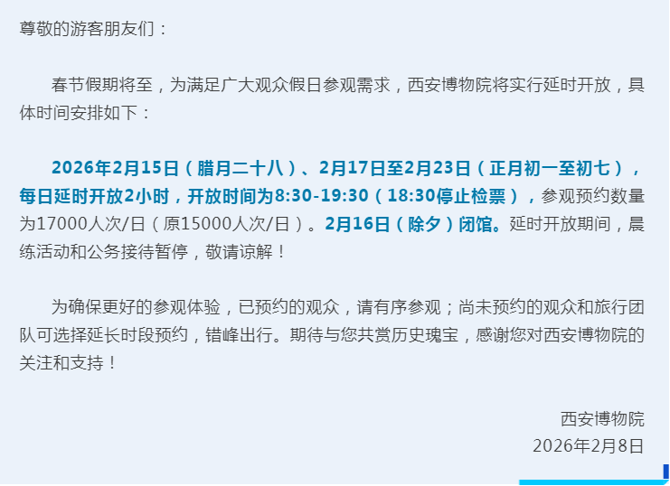 2026年2月15日(腊月二十八)、2月17日至2月23日(正月初一至初七),每日延时开放2小时,开放时间为8:30-19:30(18:30停止检票),参观预约数量为17000人次/日(原15000人次/日)。2月16日(除夕)闭馆。延时开放期间,晨练活动和公务接待暂停,敬请谅解!