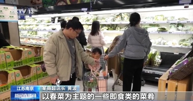 某商超店长 黄波:设立了春菜专区,同时也推出了以春菜为主题的一些即食类的菜肴,包括即食类的面点,比如说香干马兰头拌面以及香椿拌米线。