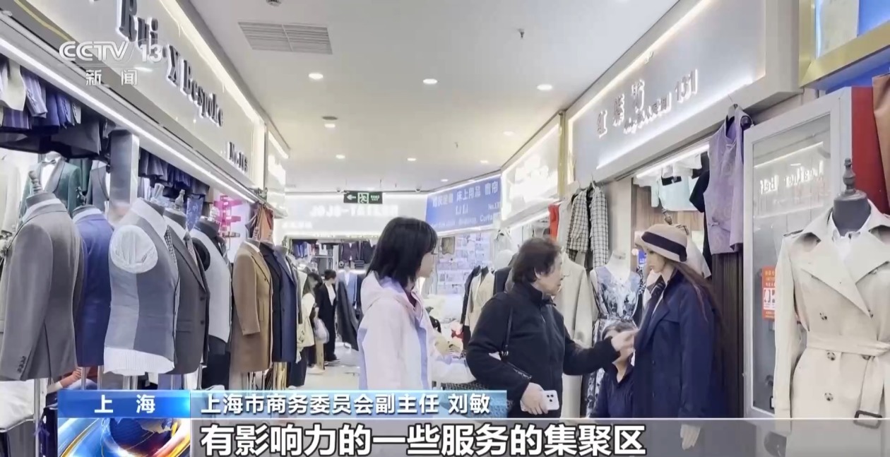 总台记者 曲涵:这里是邻近外滩与豫园商圈的南外滩轻纺面料市场。一共有1万多平方米,有280家店铺。从旗袍、西装、礼服到日常的穿搭,这里以定制消费为主,部分的商铺也会售卖成衣,种类非常齐全。几乎每一家店铺门口都挂着醒目的英文招牌,整个市场已经形成了比较成熟的国际化服务业态。