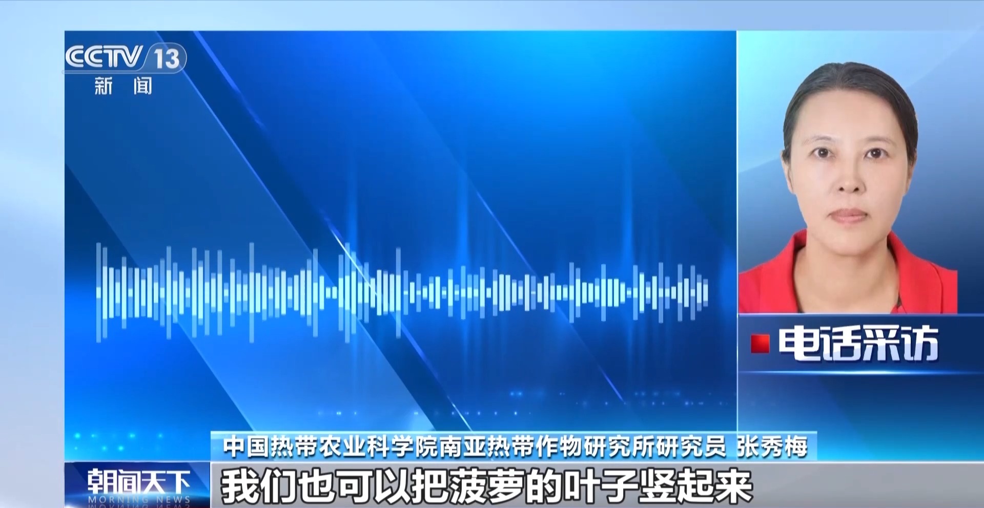 中国热带农业科学院南亚热带作物研究所研究员 张秀梅:首先是采取果实防晒,比如说套双层袋、防晒膜或者盖防晒布或者遮阴网。我们也可以把菠萝的叶子竖起来,起到防晒的作用。